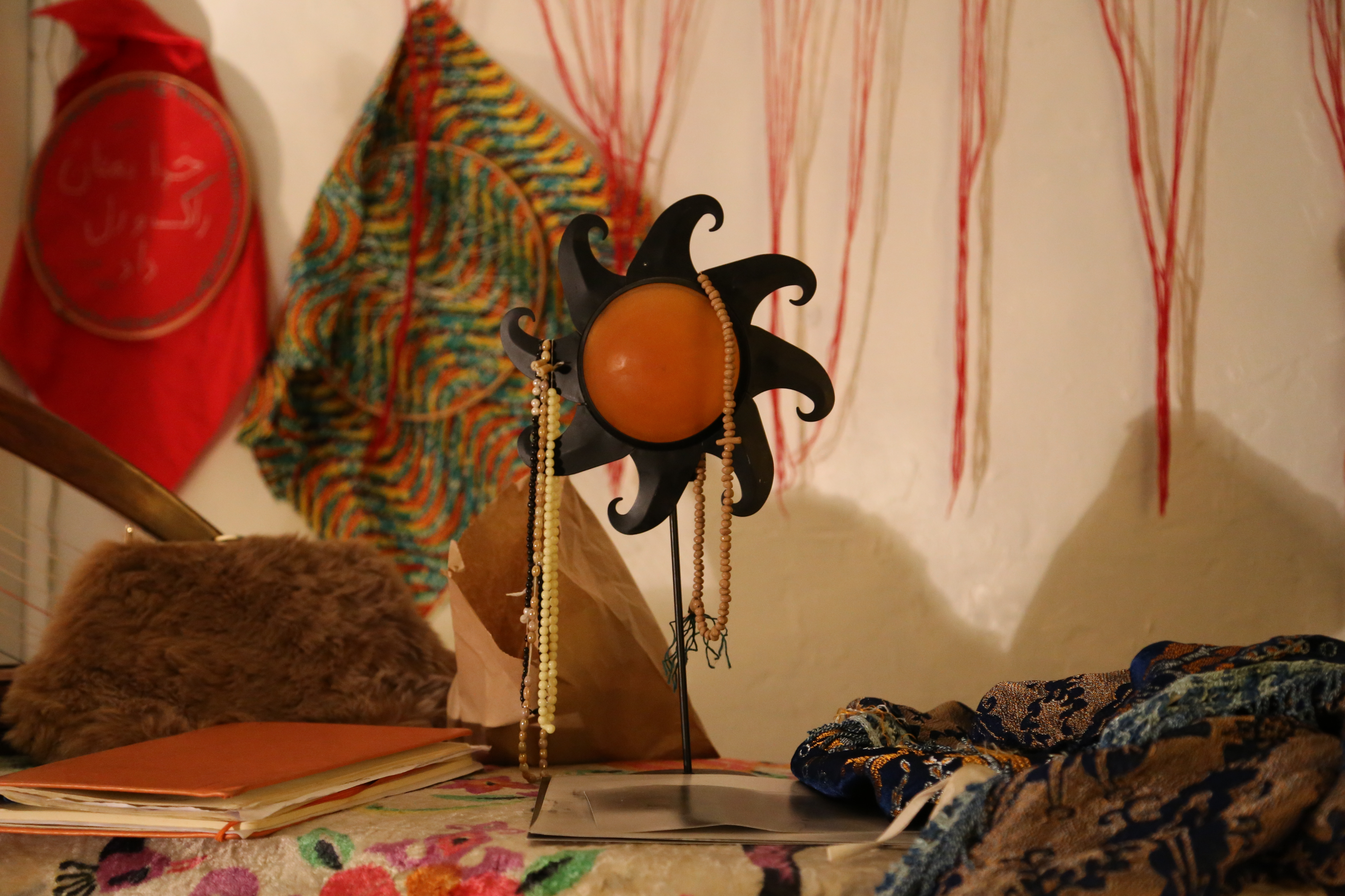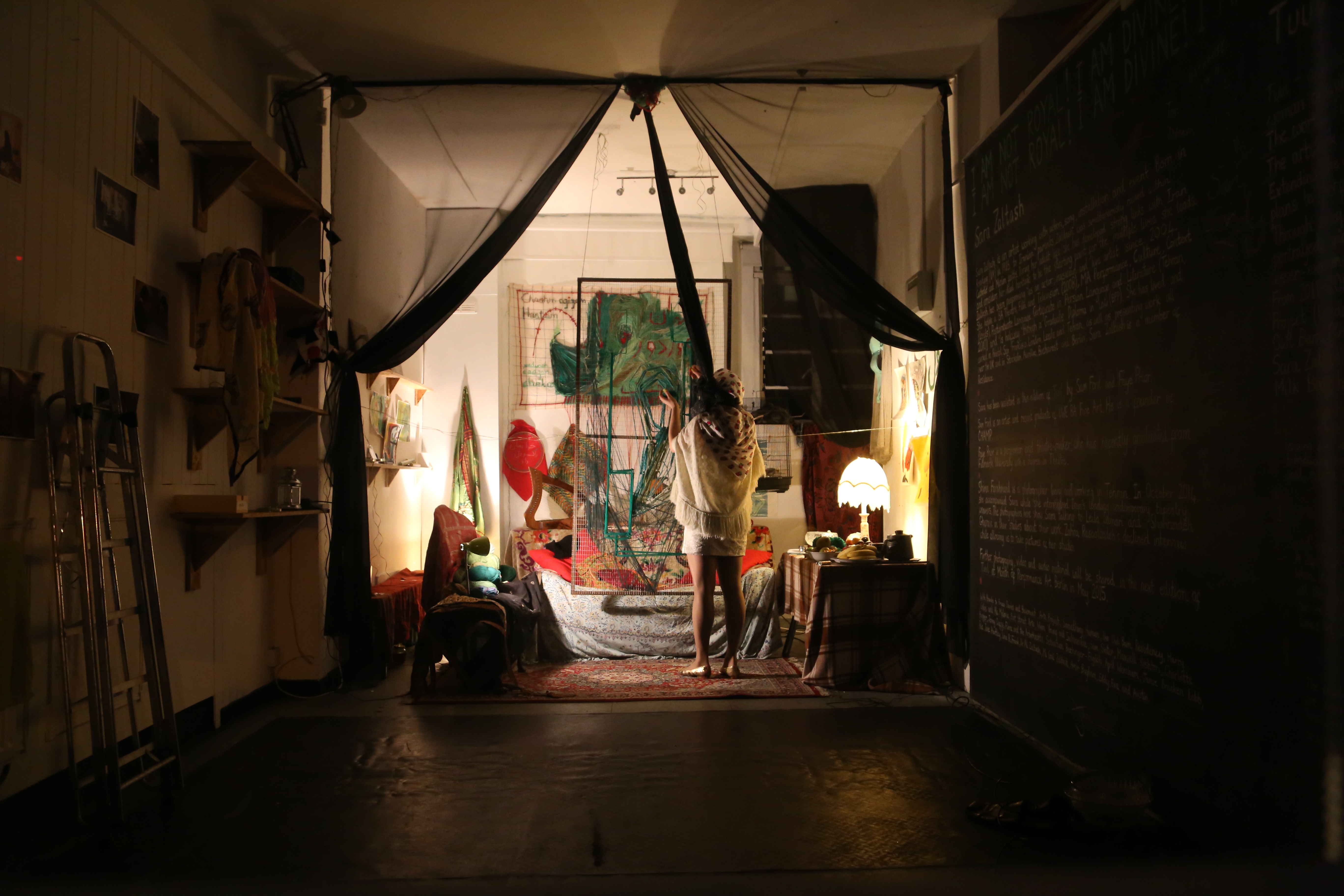 I began to draw conclusion between the body, the tapestry and the agglomeration of objects that surrounded her. Photographs, instruments, food, drawings, messages, sketches, technology, lighting and even a living parrot. There was semiotics associated with the west and the middle east. Objects of the everyday and objects of the unordinary. This work was undoubtedly biographical, hovering somewhere between the past, present and future. A statement which was certified by the extensive chalk writings along the right interior wall.