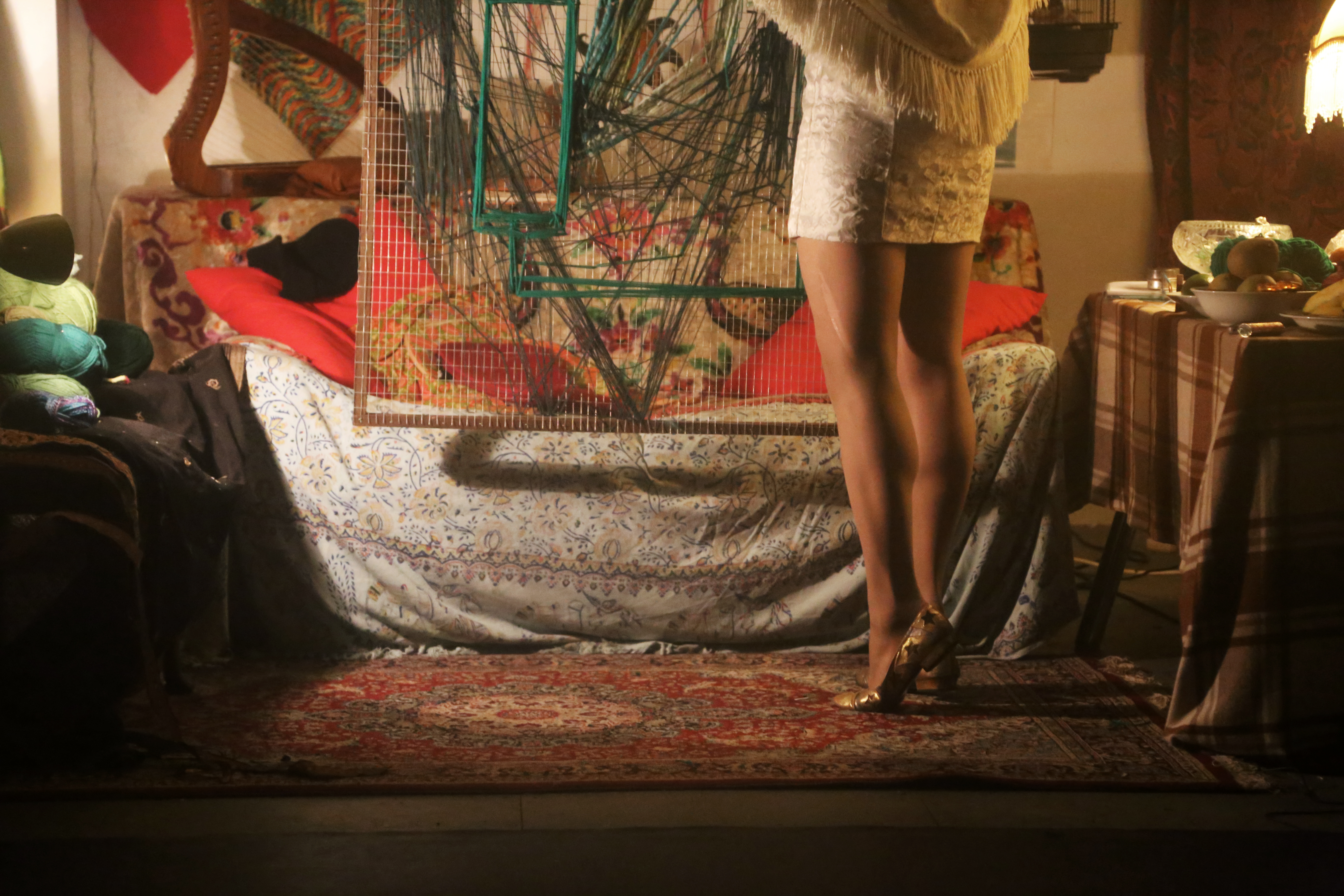 Sara Zaltash was bound from her neck to the ceiling with black cloth, like a sorcerer conducting her spells, magically lit by a series of ambient lamps. She was stood on her tip toes weaving yarn through a bird cage mesh, casting majestical shadows around the space . She was painting an uncomfortable tapestry of colours and shapes. The meaning – coded, but the expression –  present indeed.